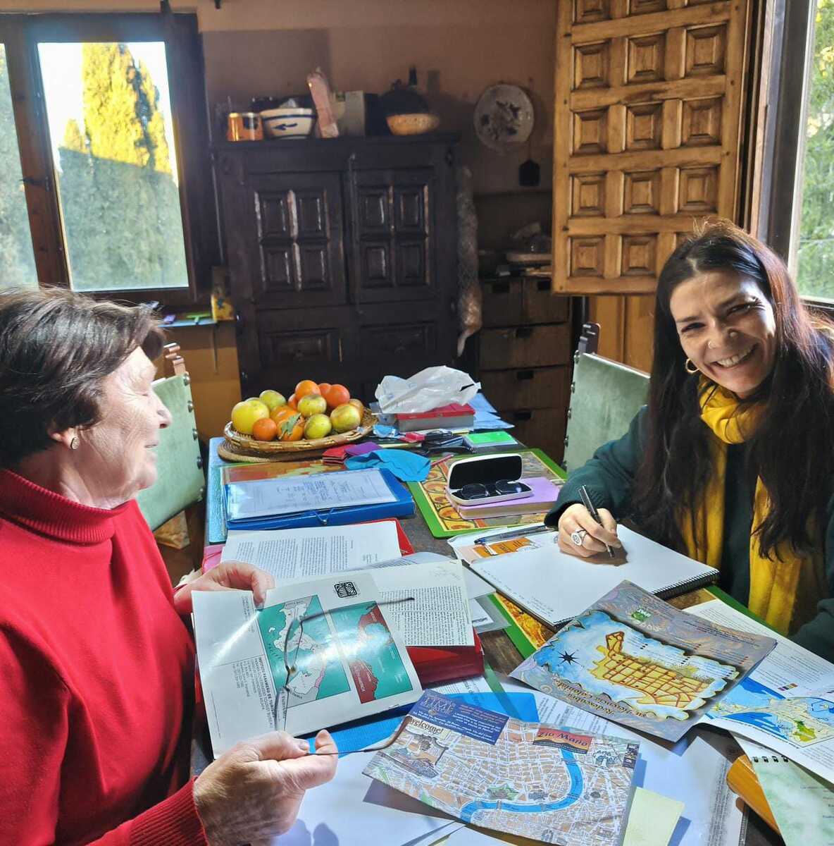Taller de trabajo de Cristina Ortega Blanco, especialista en artes visuales, y Purificación Lahoz Abad, del equipo CEINCE, con los materiales y fuentes que nuestro centro conserva sobre la figura de fray Tomás de Berlanga y sus viajes.