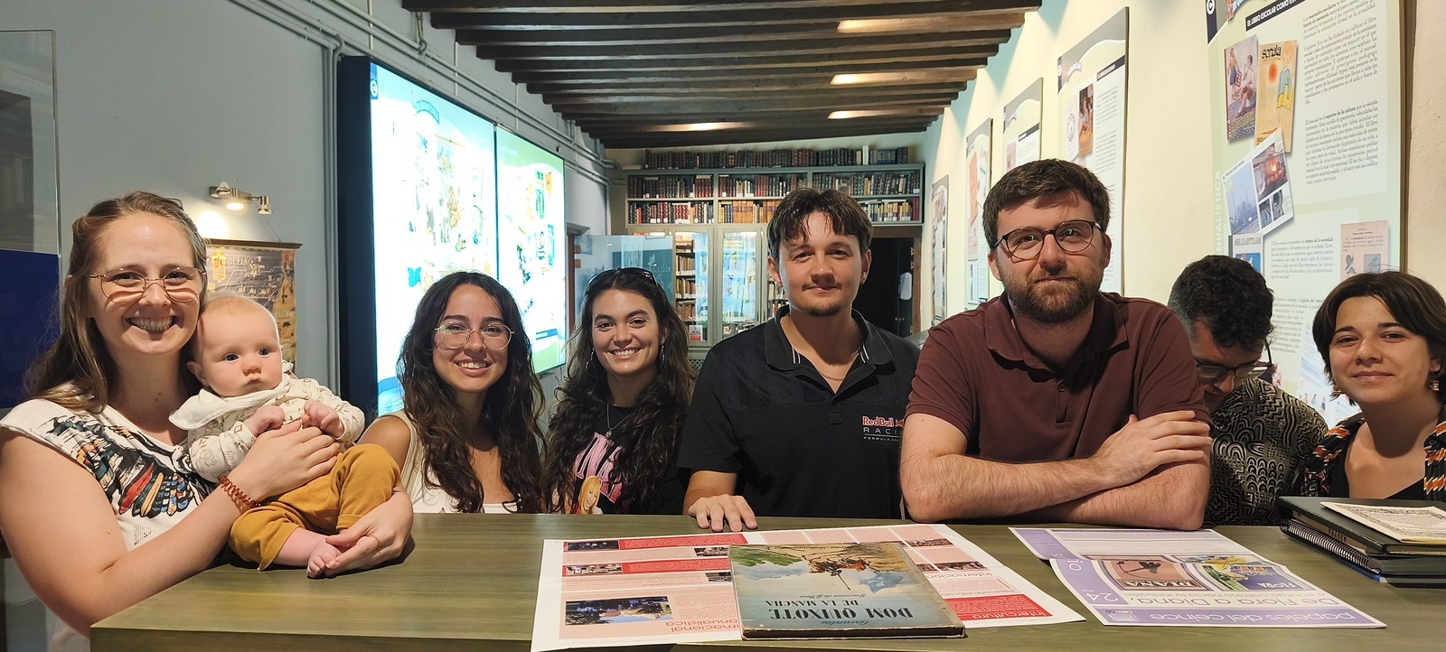 Grupo de jóvenes profesores de la Universidad de Barcelona en visita al CEINCE. Bajo la coordinación de Eric Ortega, padre del pequeño Octavi que aparece en escena, visitaron el museo de la escuela, la exposición “De Flora a Diana o el largo camino hacia la inclusión” y las bibliotecas del centro.